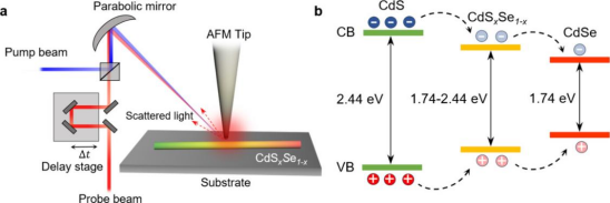 低维半导体带隙工程的最新研究进展促使微型光电子器件中的高效载流子输运成为可能。如图四所示,研究人员利用泵浦-探测近场光学系统对组分梯度递变CdS1-xSex纳米线中的载流子输运和复合进行超快纳米成像,获得时间分辨的s-SNOM微区图像序列。随着泵浦光探测延迟时间的增加,s-SNOM图像中纳米线沿着轴向方向出现强度梯度特征,如图五所示,由于从CdS侧到CdSe侧的单向电场诱导作用,观察到载流子密度在CdS侧衰减较快,载流子的空间分布向CdSe侧倾斜。研究结果提供了直接可视化的载流子传输动力学研究,为研究非均匀半导体纳米结构中复杂的载流子相互作用提供有效载体,并为优化下一代光电器件奠定重要基础。